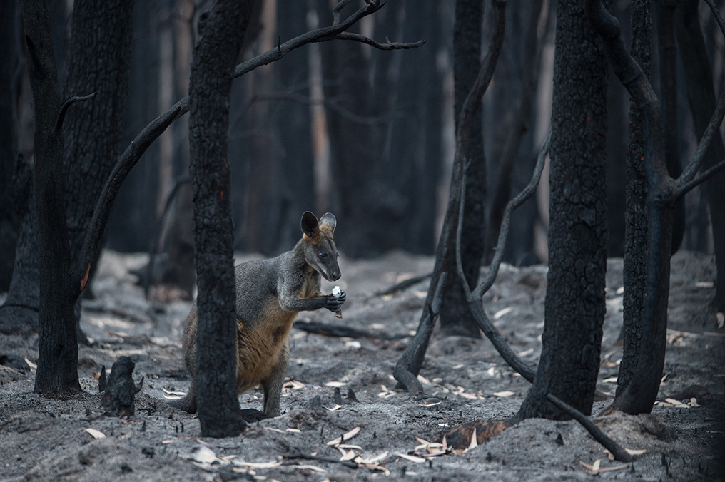 This is what a bushfire catastrophe looks like. Forests, once a blooming and fertile landscape, made of thousands of shades of green, teeming with life—birds, marsupials, ungulates, and insects—are now monochromatic and lonely. Haunted.
